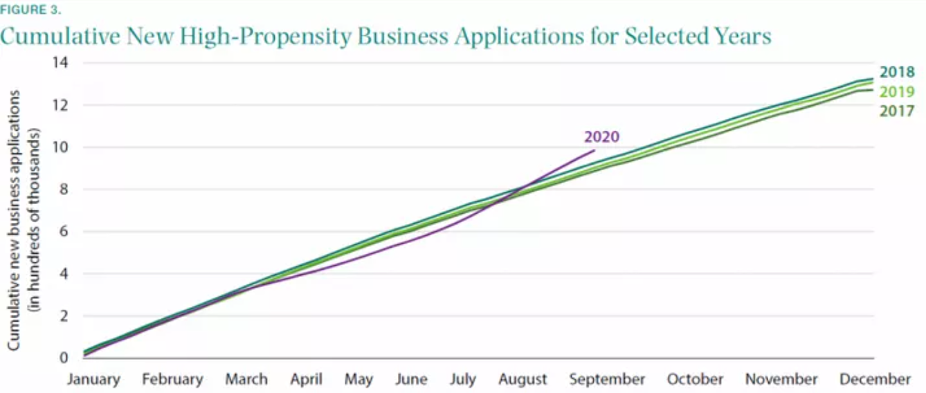 During an economic recession, start-ups tend to decline. In the current recession, the public health situation will further affect the creation of new companies. For example, in states with more deaths from the epidemic, the number of applications from companies is usually smaller.